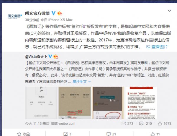阅文方面表示,《西游记》等作品中标有“签约”和“授权发布”的字样,是指起点中文网和内容提供商(CP)的签约,并取得其正规授权,作品中标有VIP指的是收费产品,以确保出版内容频道和原创内容频道标注的一致性。2017年,为更准确地表达作品标注的信息,就已对系统优化,均增加了“第三方内容提供商授权”的字样。