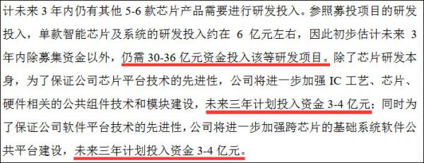 “参照募投项目的研发投入,单款智能芯片及系统的研发投入约在6亿元左右,因此初步估计未来3年内除募集资金以外,仍需30-36亿元资金投入该等研发项目。”寒武纪透露。