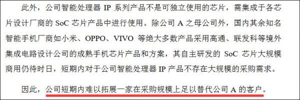 更让其困扰的是,除公司A之母公司外,国内其余知名智能手机厂商如小米、OPPO、VIVO等绝大多数产品采用高通、联发科等境外集成电路设计公司的成熟手机芯片产品和方案,其自主研发的SoC芯片大规模商用仍待时日,短期内对于其智能处理器IP产品不存在大规模的采购需求。
