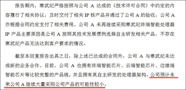 目前,公司A也拥有终端智能芯片、云端智能芯片、边缘端智能芯片等比较完整的产品线,并且拥有其自主研发的处理器架构,其预计未来公司A继续大量采购寒武纪产品的可能性较小。