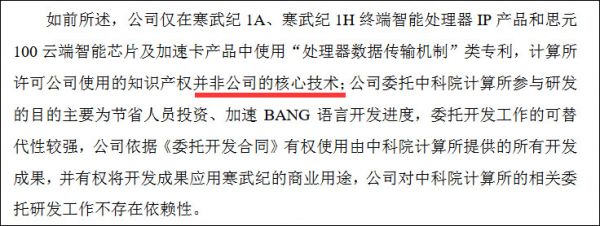 技术许可方面,其仅在寒武纪1A、寒武纪1H终端智能处理器IP产品和思元100云端智能芯片及加速卡产品中使用“处理器数据传输机制”类专利,中科院计算所许可其使用的知识产权并非核心技术。