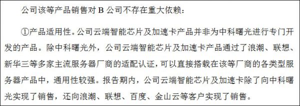 除此以外,其云端智能芯片及加速卡产品通过了浪潮、联想、新华三等多家主流服务器厂商的适配认证,并向浪潮、联想、百度、金山云等客户实现了销售,对中科曙光不存在重大依赖。