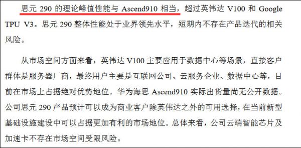 据寒武纪介绍,目前市场上存在与思元290功能类似的产品主要包括华为海思昇腾910芯片以及英伟达V100芯片;前者理论峰值性能与昇腾910相当,超过英伟达V100和Google TPUV3。