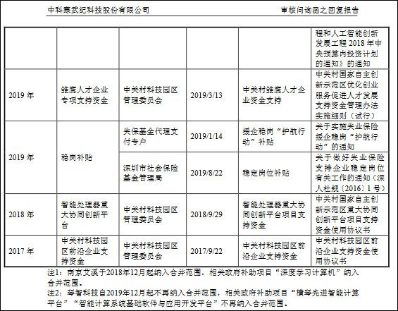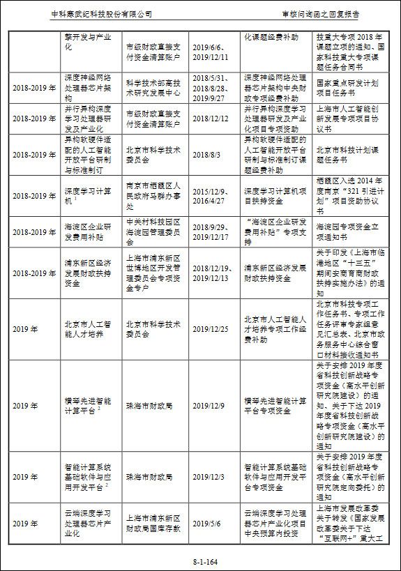 在上述时间内,寒武纪计入当期收益的政府补助金额分别为823.69万元、6914.01万元和3386.41万元,但未说明具体项目,此事也受到了上交所的关注。