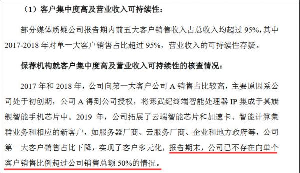 不过,仍然需要注意的是,虽然寒武纪在回复上交所时称其已实现实现客户多元化,2019年前五大客户的销售金额合计占其营收比例仍然高达95.44%。