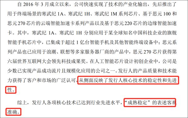 对此,寒武纪将旗下智能芯片技术、基础系统软件技术等,与英伟达、华为海思等进行逐一对比后表示:“在人工智能芯片设计初创企业中,公司是少数已实现产品成功流片且规模化应用的公司之一。发行人的产品质量和技术能力获得了客户和市场的广泛认可,从侧面反映了发行人核心技术的稳定性和先进性。”