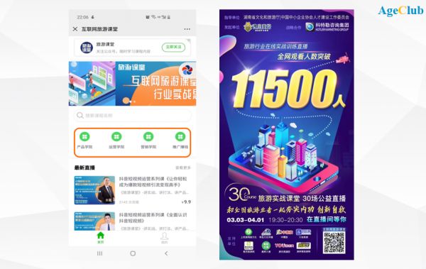 此外,想乐时光、退休俱乐部、铂年生活家等老年行业的公司都分别推出了“云游圆明园”、“千岛湖自由行套餐”、“走进胡雪岩故居”等旅游在线直播活动。