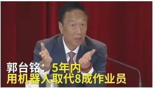 电子制造业巨头富士康,在高峰生产期工人总数曾高达 130 万人。近年,郭台铭一直积极寻求「工业 4.0」的转型,并在采访中提到「未来五年内,要将 80 % 的工人进行裁员或培训转型」。