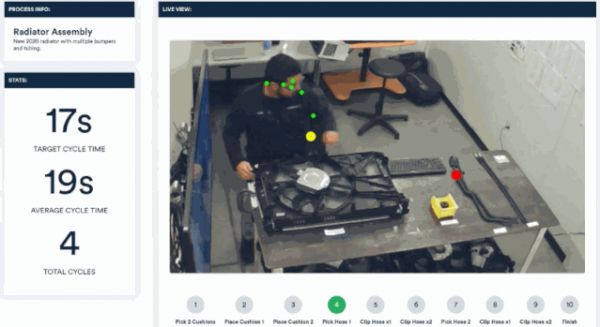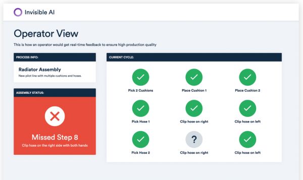 Invisible AI 推出了一种基于摄像头的计算机视觉解决方案,可应用到工厂的生产线上,通过视频监控工人组装的过程,在发生纰漏时进行及时提醒。
