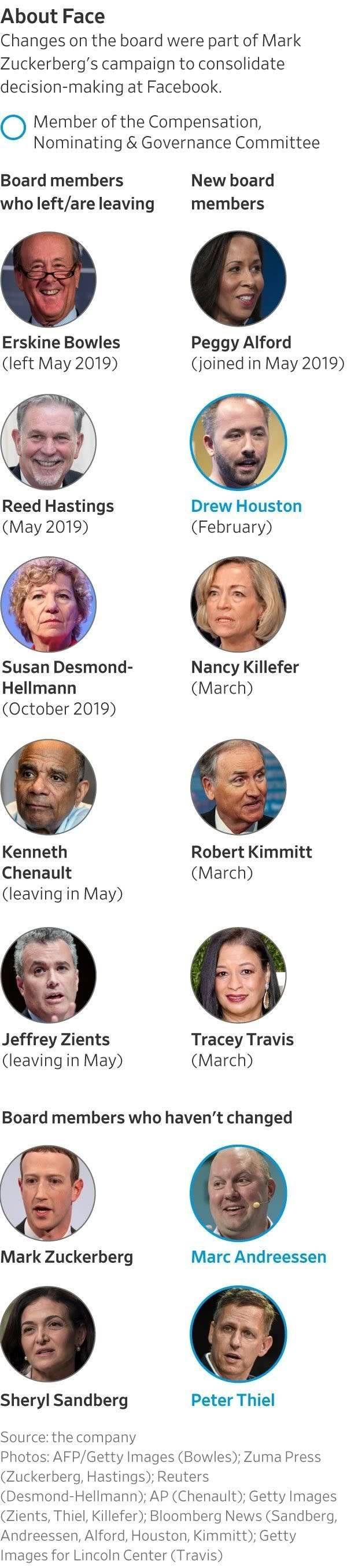 相对于2019年初的公司董事会,现在只有4人留任,分别是扎克伯格、桑德伯格、安德森和风险投资家彼得·蒂尔。