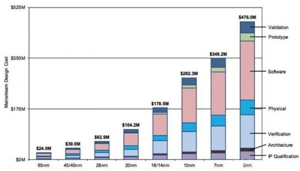 不同工艺下的典型芯片流片成本图,28nm后成本开始迅速上升
