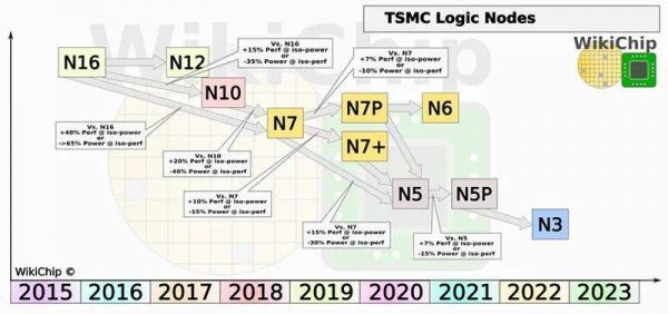 伴随着制程的进化,5nm比7nm芯片性能提升15%,功耗降低30%;3nm又比5nm芯片性能提升10%~15%,功耗降低25%~30%。
