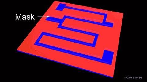 此时,涂层被光照到之处发生反应溶解,没有被照到之处保持不变,掩膜上的图案就被转移到芯片光刻胶涂层上。
