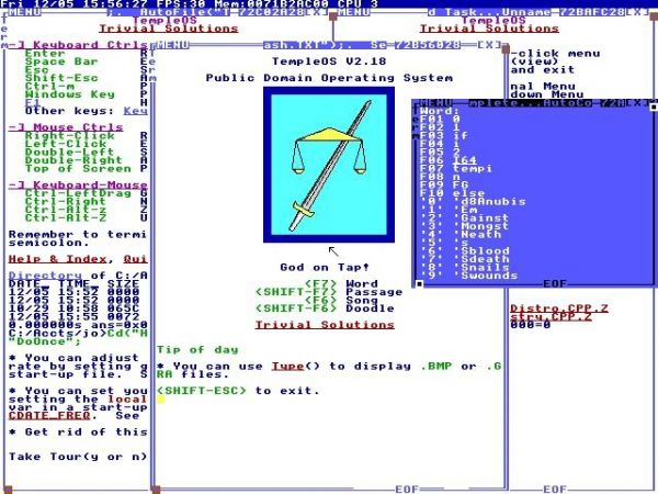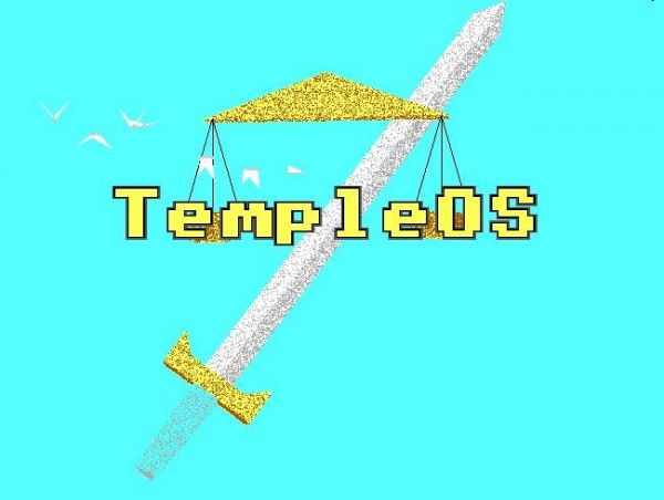 打开 TempleOS 的界面,屏幕中央会出现一把利剑和一个天平,有人猜测这是取材于正义女神像手持的剑与天平。
