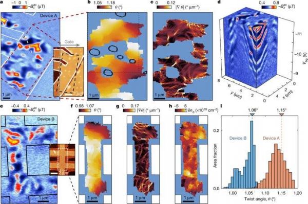 魔角扭曲双层石墨烯(MATBG)超导性能关键取决于中间层扭曲角(θ)的大小。作者使用纳米级针尖扫描超导量子干涉装置(SQUID-on-tip),获得处于量子霍尔态的朗道能级的断层图像,并绘制了局部θ变化图。