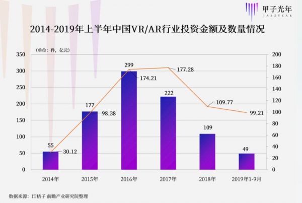 投资金额和数量记录了行业热度的大逆转:国内对VR赛道的投资,从高峰期2016年的299亿元下降到2018年的109.77亿元,两年内缩水2/3。