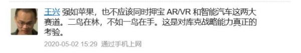 王兴近期在“饭否”上发言:强如苹果,也不应该同时押宝AR/VR和智能汽车这两大赛道,这意味着在王兴的思考中,AR/VR是能与智能汽车等量齐观的未来机会。