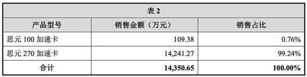 两张表格中各产品型号的销售占比有所差异,主要原因是寒武纪实施智能计算集群业务主要集中在2019年四季度,思元270芯片及加速卡已量产,算力比思元100高,能更好支撑该项目的实施。