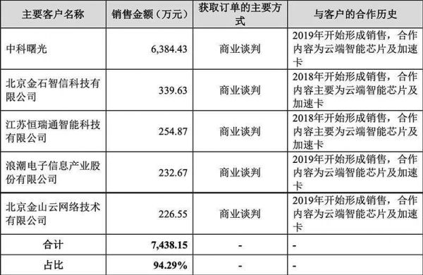 除向关联方中科曙光销售云端智能芯片及加速卡产品之外,其非关联方主要客户包括恒瑞通、浪潮电子、金山云等,销售金额合计为1503.81万元。
