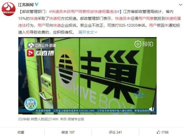 对于快递柜收费,相关部门也进行了表态。据媒体报道,江苏省邮政管理局表示,快递员未征得用户同意就投到快递柜属违法行为,用户可向快递企业投诉。用户若因未通知投递入柜导致收费的,应积极维权。