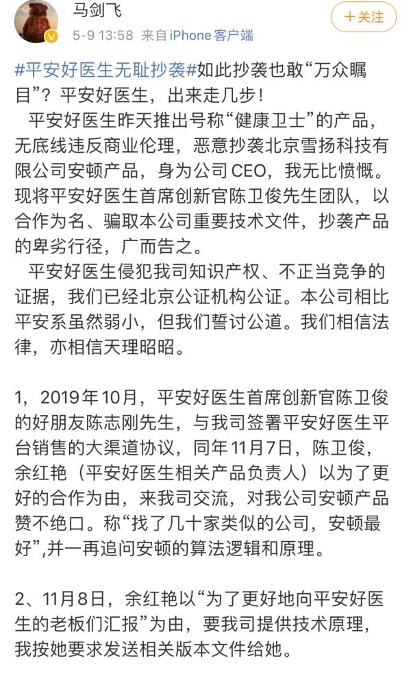 马剑飞微博截图(局部)同日,在一场新闻发布会上,雪扬科技宣布正式起诉平安好医生,要求赔偿5000万元,并终止相关业务的开发。