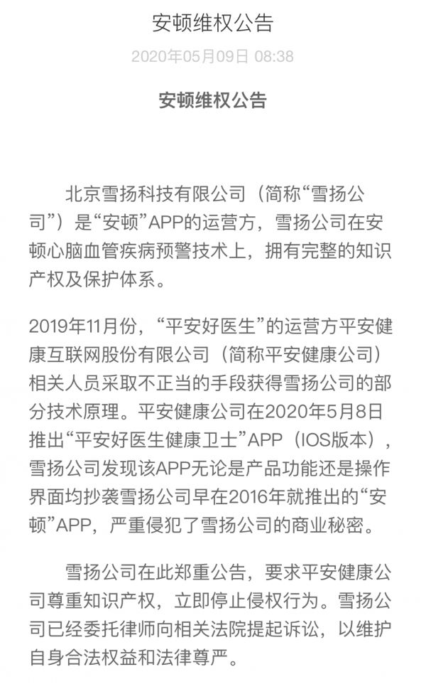 安顿官网贴出的维权公告截图雪扬科技方便认为,“平安好医生健康卫士”APP与“安顿”APP非常神似,无论是产品功能还是操作界面均为抄袭,严重侵犯了雪扬公司的商业秘密。