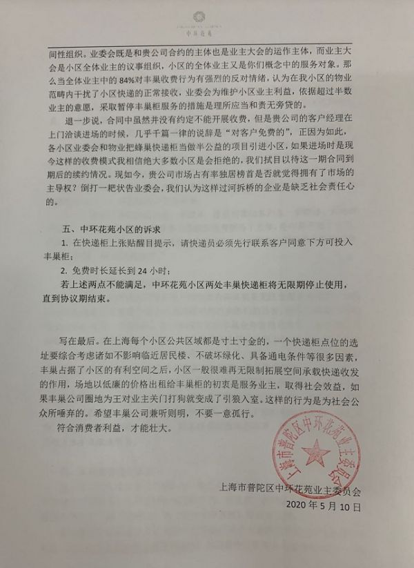 5月10日上午,上海首家因丰巢超时收费而停用的小区中环花苑发出致丰巢的公开信。