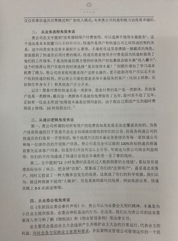 公开信中还提到丰巢进驻小区时的谈判问题,其中表示,退一步说,合同中虽然并没有约定不能开展收费,但丰巢的客户经理在上门洽谈进场的时候,几乎千篇一律的说辞是“对客户免费的”,正因为如此,各小区业委会和物业把蜂巢快递柜当做半公益的项目引进小区,“如果进场时是现今这样的收费模式我相信绝大多数小区是会拒绝的,我们拭目以待这一期合同到期后的续约情况。现如今,贵公司市场占有率独居榜首是否就觉得拥有了市场的主导权?倒打一耙状告业委会,我们认为这样过河拆桥的企业是缺乏社会责任心的。”