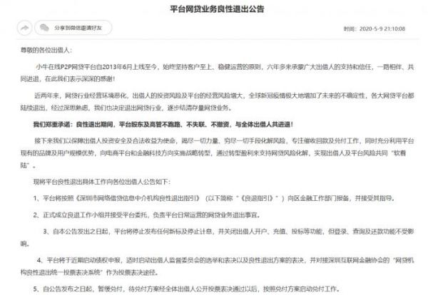 5月9日,小牛在线P2P网贷平台在其官网发布《平台网贷业务良性退出公告》称,近两年来网贷行业经营环境恶化,出借人的投资风险及平台的经营风险增大,全球新冠疫情极大地增加了未来的不确定性,各大网贷平台都陆续退出,经过深思熟虑,公司也决定退出网贷行业,逐步结清存量网贷业务。