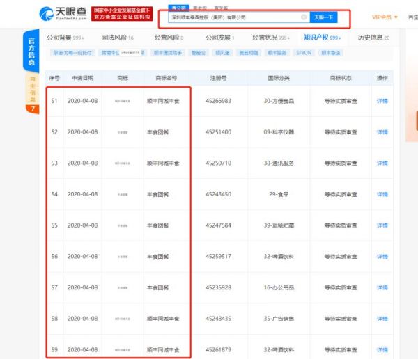 新京报记者通过天眼查获知,4月8日,深圳顺丰泰森控股(集团)有限公司在方便食品、啤酒饮料、运输贮藏等类别上申请“顺丰同城丰食”“风食团餐”注册商标。截至5月11日,上述商标均在“等待实质审查”,尚未注册完成。而深圳顺丰泰森控股是深圳顺丰同城信息技术公司的间接百分百控股股东。
