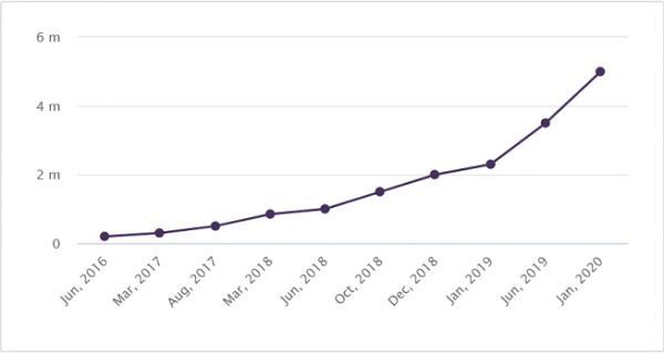 N26立足于欧洲之后也没有停止其发展的脚步。2019年2月进军巴西市场,随后7月登陆美国市场。截至2020年1月,N26用户数量已超过了500万,交易量超过了200亿欧元。公司运作良好,2018年实现了5820万英镑的收入;用户群体活跃,2019年平均每天有25万用户使用量。