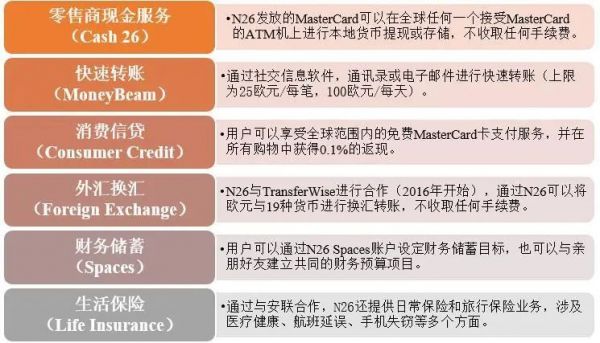 N26为用户提供了一系列低价高值的银行服务,包括Cash26(零售商现金服务)、MoneyBeam(快速转账)、消费信贷、外汇换汇、Spaces(财务储蓄)和生活保险六种主要服务。另外,N26还提供例如投资组合、利息储蓄账户等其他金融服务。