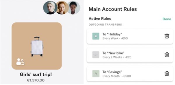 为了方便客户管理账户资金,N26还上线了特色的财务储蓄(Spaces)功能。用户可根据自身财务储蓄目标,在主账户下设立目标子账户并建立相应转账规则。系统将根据该规则定期在主账户与子账户间自动转账。用户可随时查看所有交易记录,打印月度财务报表,了解自身财务状况,轻松地管理账户资金。同时,高级用户还可通过Shared Spaces子账户共享功能,邀请最多10位朋友共同管理子账户资金。