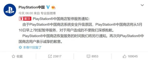 根据官方的说法,PlayStation中国商店将从5月10日早上7时起暂停服务,恢复服务的时间将另行通知。