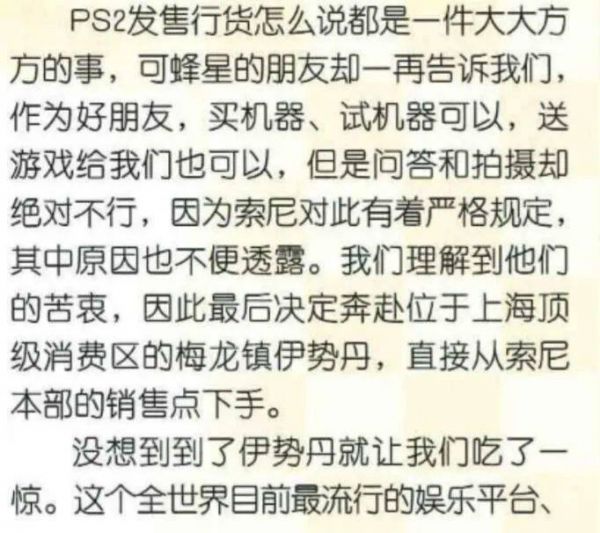 比如当时PS2虽然已经正式发售,却极其低调,对外口径极其严格。即便发售PS2行货的店家是电软编辑的好朋友,依然只能说“买机器可以,回答和拍摄绝对不行”。
