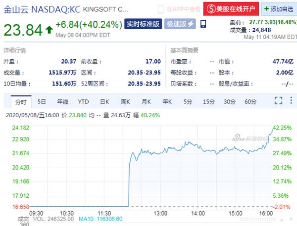 新浪科技讯 北京时间5月11日下午消息,金山云盘前涨超16%,市值超47亿美元。