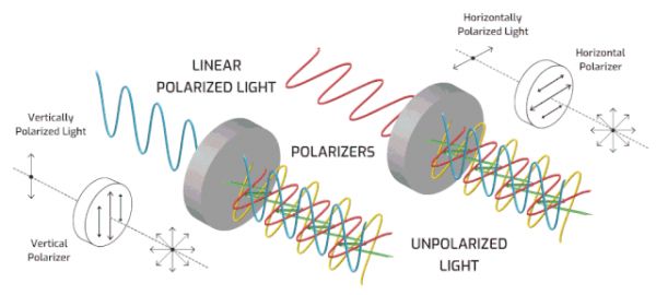 向动图右边这样,只在一个平面上振动的光就叫做(线)偏振光。阳光相当于动图左边,是各种偏振光的大杂烩,没有明显的偏振。