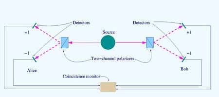 1964年,贝尔提出了这样一个实验:让两个纠缠的光子(纠缠就是说它俩状态协调一致)分别经过两个偏振片,然后在中央汇合。如果它们同时到达中央,这个事件就叫做同时符合(conincidence)。同时符合事件的发生率就叫做同时符合率,类似于透过偏振片的光强。