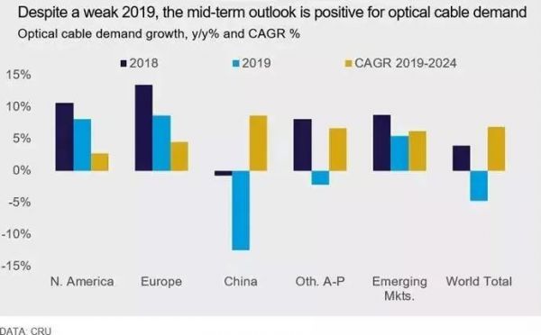CRU的数据显示,2019年中国光纤光缆市场的需求预计下降12.5%,而中国FTTH的光纤需求量预计下降11%。