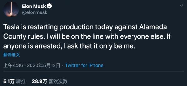特斯拉今天要违反阿拉米达县(Alameda County)的规定,准备复工生产。我将和大家站在一条线上,但若是要抓人,那就逮捕我一个人好了。
