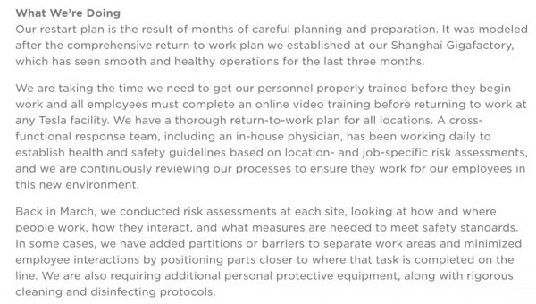 早在3月份,特斯拉便对每个工地进行了风险评估,考察员工如何工作、在哪里工作、他们如何互动,以及需要采取哪些措施来满足安全标准。
