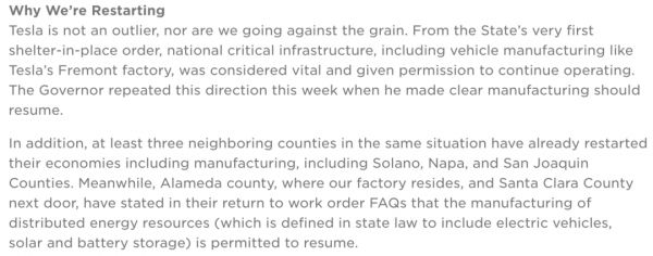 特斯拉不是一个例外,也不是非要“逆流而上”,从加州下达第一个“居家隔离”政令开始,像特斯拉这样的汽车制造厂便被认为是至关重要的基础设施,并被允许继续运营。