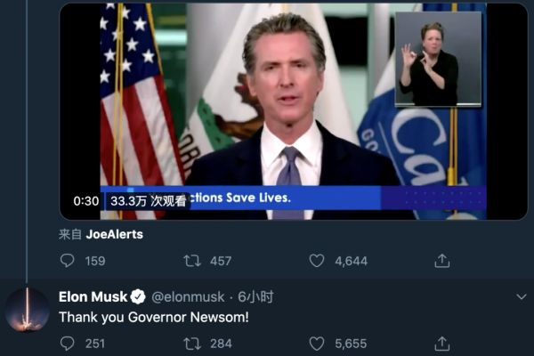 在整个事件的过程中,加州州长Governor Newsom是非常支持特斯拉复工的:从开始下达复工政令,到后续的支持。
