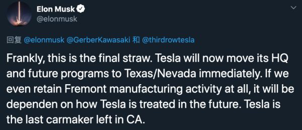 因此,马斯克早在5月9日曾“威胁”说要把特斯拉工厂搬离加州: