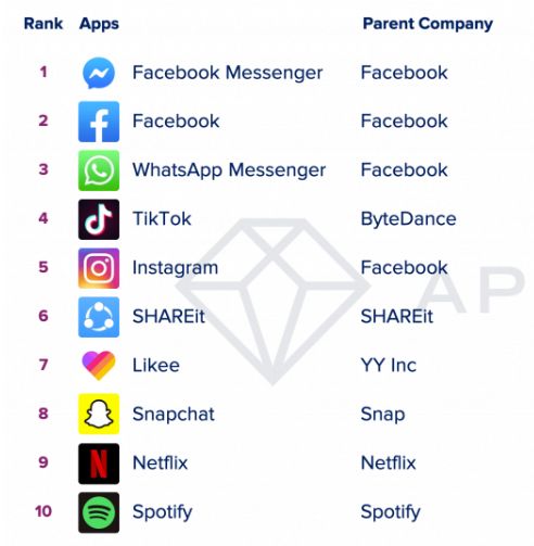 2019年各大App全球范围下载量排行榜中,TikTok超越了Instagram,仅次于Facebook的三款社交产品,位列第四。