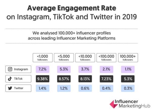 相比Instagram和Twitter,TikTok的用户参与度(engagement rate)最高。(用户参与度是衡量平台流量变现能力的重要指标,它监测用户的分享、点赞、评论等参与次数。)