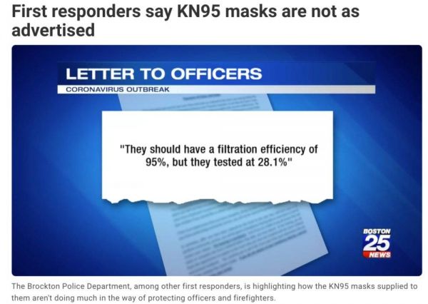好景不长,美国布罗克顿警察局在数周前,指出他们进口的中国KN95口罩,过滤度经过测试仅有28.1%,离95%相差甚远。远远起不到保护一线警务人员的作用。