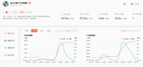 虽然朱瓜瓜早在2017年就已经注册抖音账号了,但认真运营也就在近几个月的事情,无论是整体的137.5万粉丝,还是每条作品平均不到1万赞的互动量,在大网红动辄千万粉丝,互动几十万赞的抖音世界里,可以说其IP获取流量的能力并不出众。