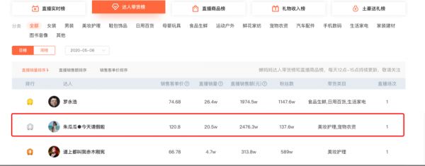 从行业数据网站上我们可以看到,朱瓜瓜在整个抖音的带货达人序列中排名第二,是除开官方流量扶持的罗永浩之外带货能力最强的主播。