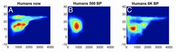 如图所示,纵轴是平均气温,横轴是平均湿度,图中越靠近红色,越适宜人类生存。三幅图分别代表了当代(A)500年前的中世纪,(B)6000年前的史前时代,(C)这三个时期,适合人类居住的区域所具备的温度湿度环境。